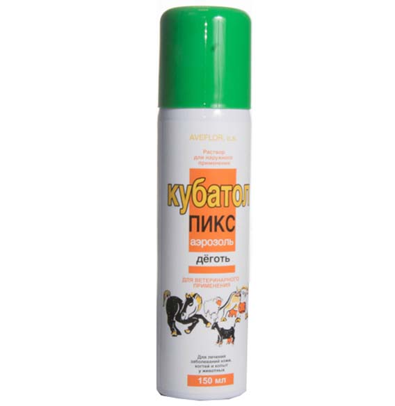Кубатол Пикс предназначен для лечения заболеваний когтей, копыт и кожи животных. Препарат назначается для лечения ссадин, ран, экзем, нагноений и др. Поскольку Кубатол предназначен для наружного применения, он поставляется в виде спрея.Кубатол Пикс применяют сельскохозяйственным и мелким домашним животным (за исключением кошек) при различных поражениях кожи, таких как ссадины, дерматиты, экземы, медленно заживающие раны, а также заболевание когтей (поверхностный панариций и др.) и копыт (нагноение роговой стрелки др.). Перед нанесением лекарственного средства проводят санитарную обработку пораженной поверхности кожи. Затем флакон с лекарственным средством тщательно встряхивают и, держа его вертикально, распыляют Кубатол Пикс на пораженный участок с расстояния 15-20 см от обрабатываемой поверхности в течение 1-2 секунд один или два раза в сутки. После нанесения лекарственного средства животному не позволяют слизывать образовавшуюся пленку в течение 5минут. Продолжительность лечения составляет от 3 до 8 дней, определяется лечащим ветеринарным врачом в зависимости от тяжести поражения и скорости заживления тканей. Обработка животных следует проводить в хорошо проверенном помещении. При лечении поражений в области головы следует предотвращать попадание лекарственного средства в глаза.