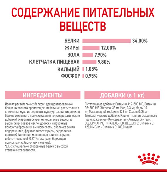 Здоровое пищеварение: Комбинация пребиотиков (МОС) и высокоусвояемых белков (L.I.P.) поддерживает баланс кишечной микрофлоры, обеспечивая комфортное переваривание и оптимальное качество стула.