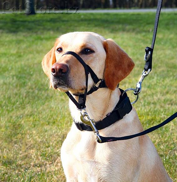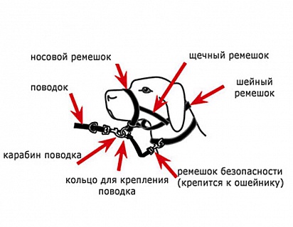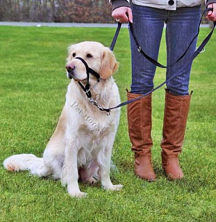 Недоуздок надевается на морду собаки наподобие намордника, с помощью металлического карабина крепится к ошейнику, с помощью металлического кольца - к карабину поводка. Таким образом, Вы держите собаку не за шею, а за голову и можете деликатно направлять голову собаки, управляя ее движениями. При натягивании поводка собаке будет некомфортно, и ей придется поворачивать голову на бок.